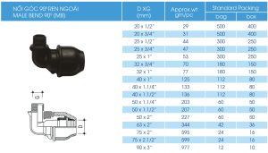 Bảng thông số phụ kiện nối góc 90 độ ren ngoài HDPE Dismy