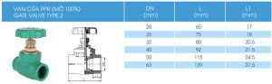 Bảng thông số phụ kiện van cửa PPR mở 100%